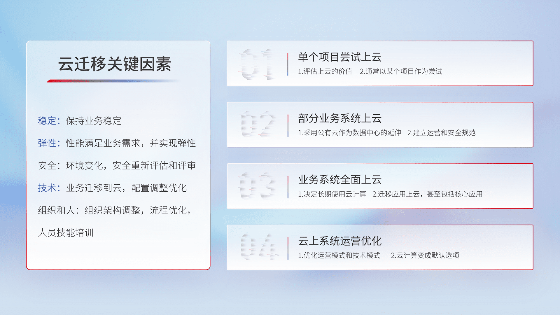 结合实际业务,,,,从规划设计、、、云平台选型、、、、云原生改造、、、数据迁移、、、集成交付,,迁移全过程为客户识别最佳上云路径,,,做好风险识别管理,,设计网络架构、、、身份权限、、安全审计合规、、、、操作审计、、日志审计、、监控告警策略、、、多站点容灾设计等,,对云上基础设施进行整体规划,,,提升IT治理水平,,,以满足弹性、、高可用、、、、高性能的需求。。。