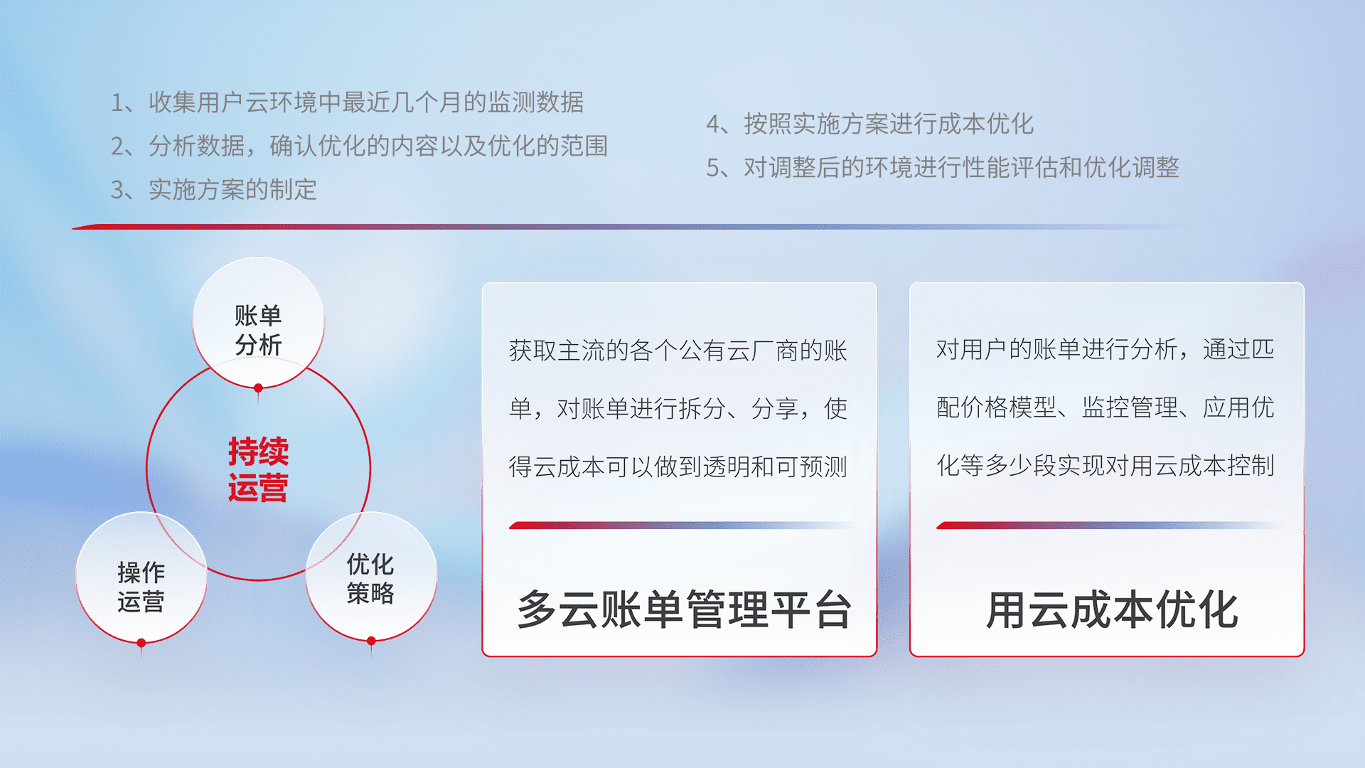 通过多云纳管,,,,以统一的资源数据模型把客户的云资源进行抽象和封装,,,进而实现对多云资源的统一操作,,,,保障云资源管理的可靠性、、稳定性与可用性。。量身定制化运维内容,,,,配置、、开发运维、、、、补丁管理、、、备份、、、、监控、、、、认证和访问管理、、、审计和日常巡检等,,,,保障在用云过程中的可靠度,,,稳定度以及高可用率。。