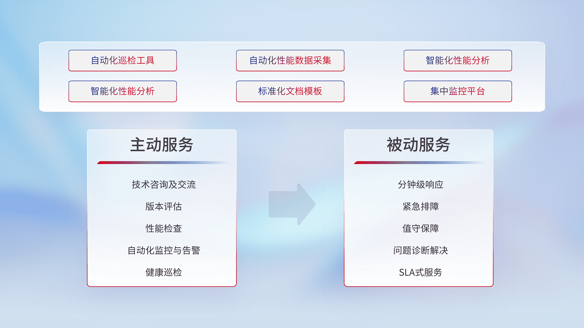 智能化工具和标准化文档,,保障服务质量,,,提供主动服务(包含技术咨询、、版本评估、、、、性能检查、、、、自动化监控与告警、、健康巡检)和被动服务包含(分钟级响应、、紧急排障、、、值守保障、、、、问题诊断解决、、、、SLA服务)。。。