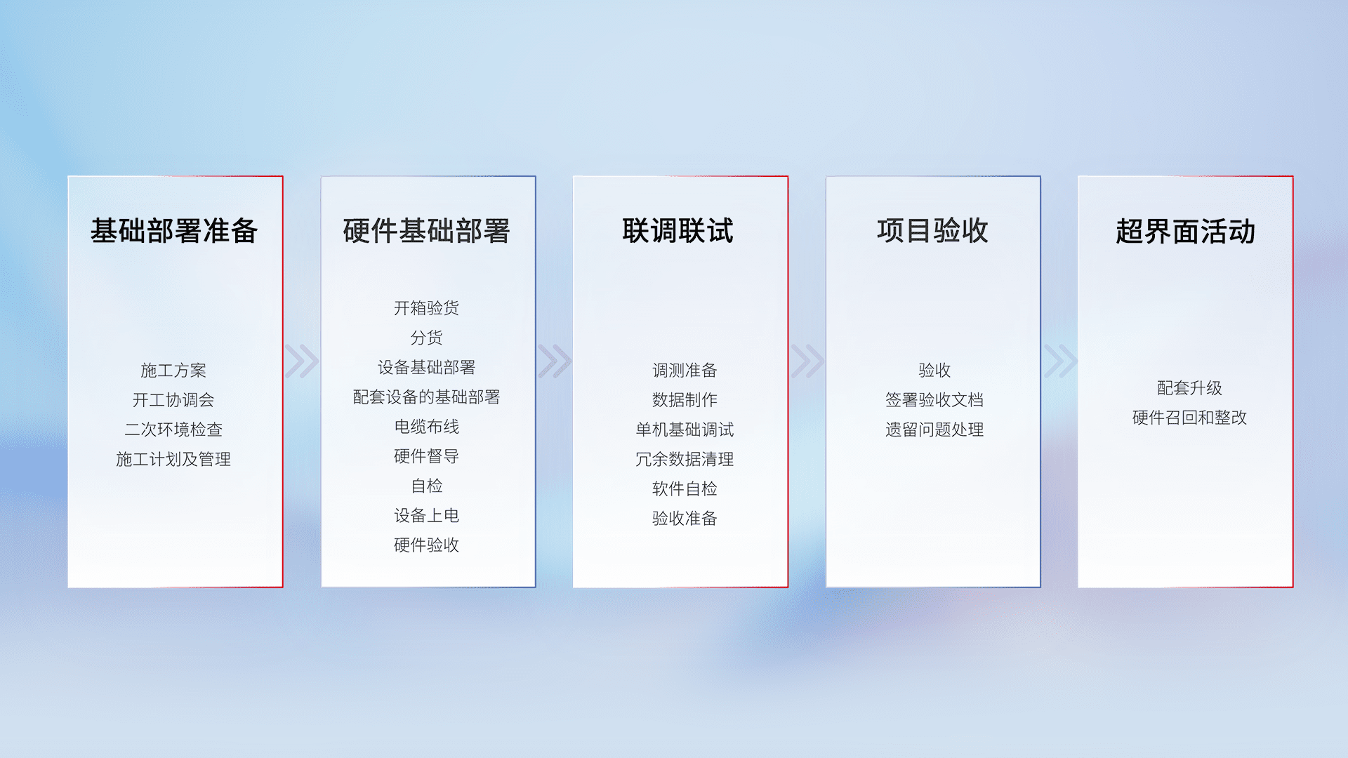 从基础部署准备、、、、硬件基础部署、、、、联调联试、、、项目验收、、、越界面活动的全过程可追溯,,保证施工质量和进度。。。。